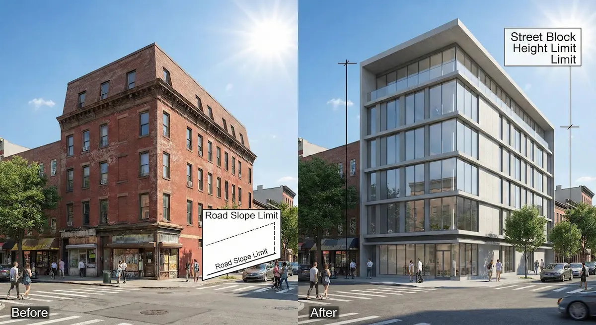 - 도로 사선제한이란? 도로 폭을 기준으로 건물의 높이를 제한하는 법규입니다. (건물 높이 ≤ 도로까지 수평거리 × 1.5배)