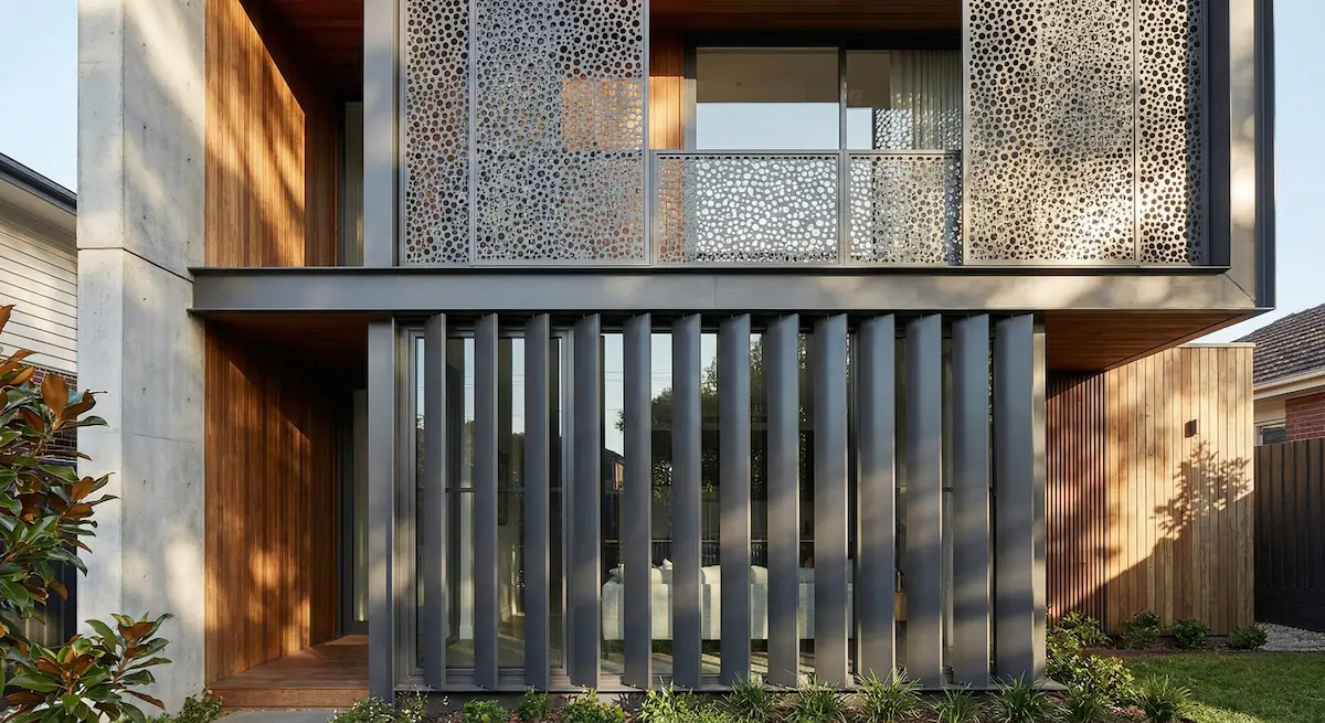 - 타공 패널 (Perforated Metal): 촘촘한 구멍이 뚫린 금속판으로, 내부에서는 밖이 은은하게 보이지만 밖에서는 안이 보이지 않는 효과가 있습니다.