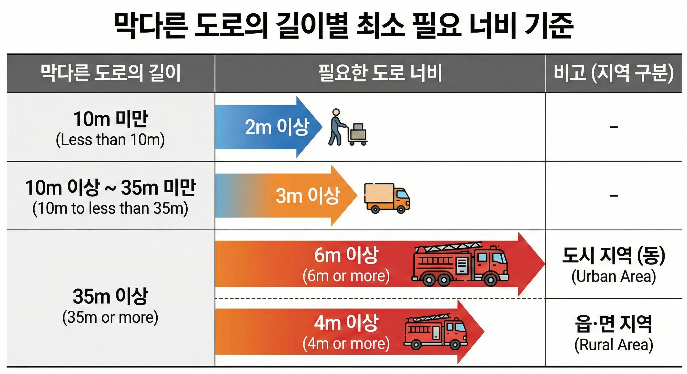 보통 골목길 끝집이나, 주택단지 안쪽 깊숙한 필지에 접한 도로가 이에 해당합니다. 이런 도로는 차량 통행량이 적어 조용하지만, 비상시 차량 소통이 어렵기 때문에 '도로의 길이'에 비례하여 필요한 '너비'가 단계적으로 늘어납니다.